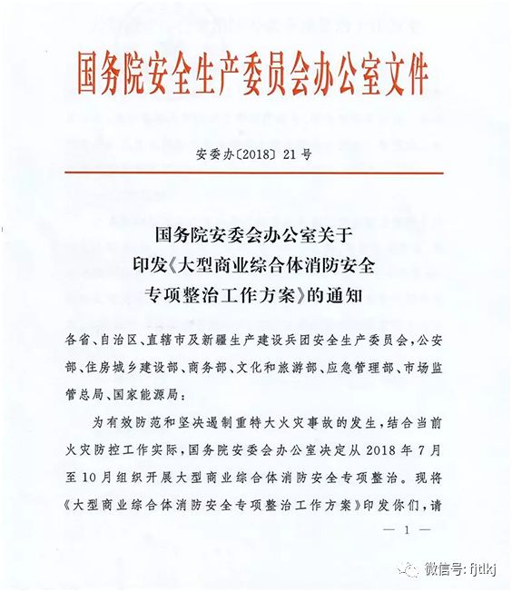 近年来,我国大型商业综合体逐年增多。这类场所一旦发生火灾,损失大、伤亡大、影响大,灭火救援困难。为切实加强火灾防控工作,充分保障人民群众生命财产安全,国务院安委会办公室决定在全国范围内组织开展大型商业综合体消防安全专项整治。特制定工作方案如下: